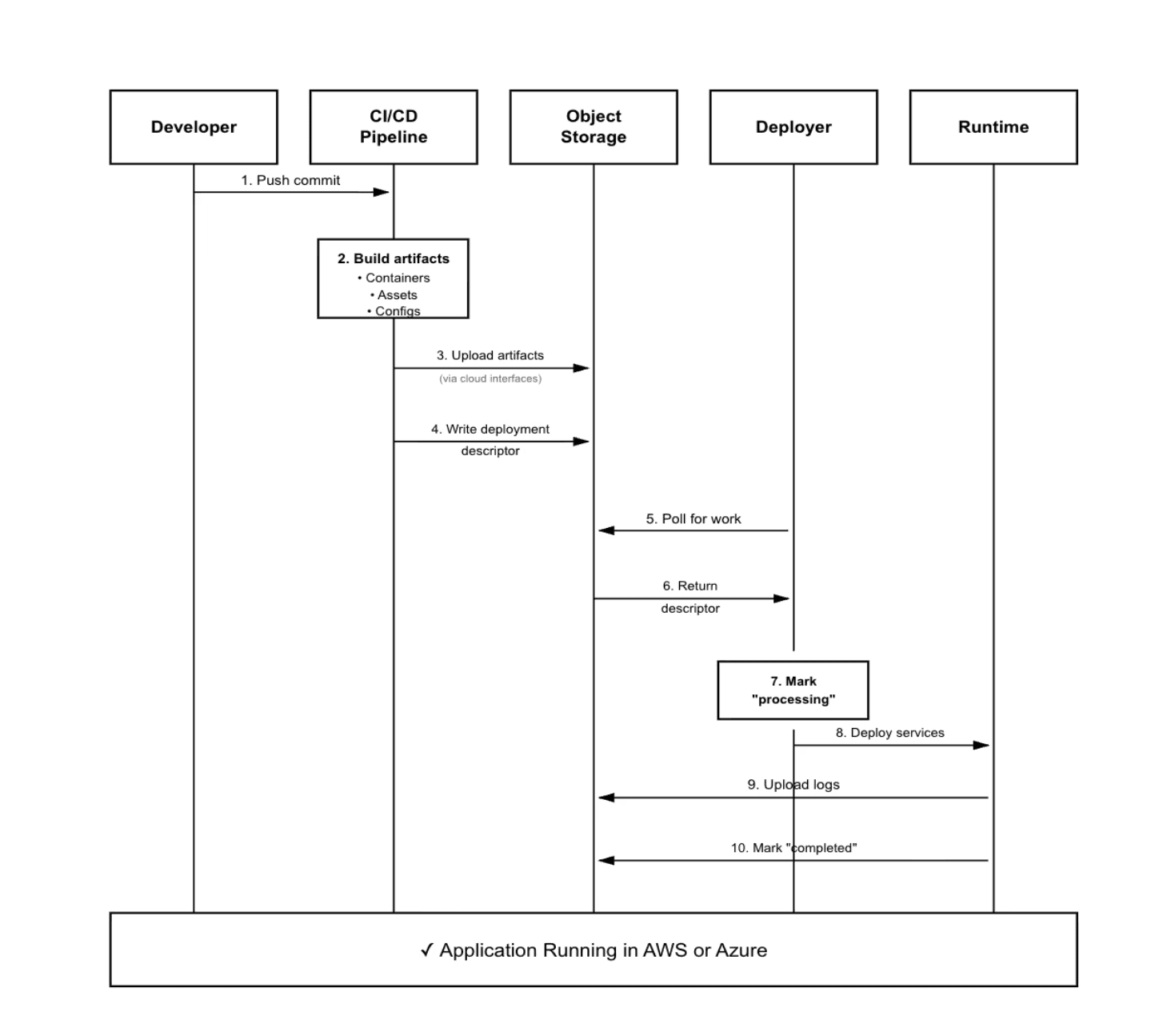 The deployer grabs the artifacts, runs the deployment, uploads logs, and updates the status